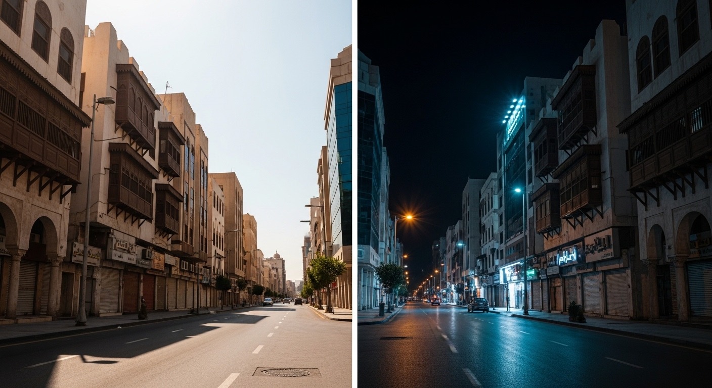 في النهار، يوفر ضوء الشمس إضاءة طبيعية ومتوازنة تسهّل إظهار التفاصيل الدقيقة والألوان الواقعية. أما في التصوير الليلي، فالمصور يعتمد على مصادر ضوء محدودة مثل إنارة الشوارع، اللوحات الإعلانية، أو الإضاءة الصناعية، وهو ما يتطلب ضبطًا دقيقًا لإعدادات الكاميرا.